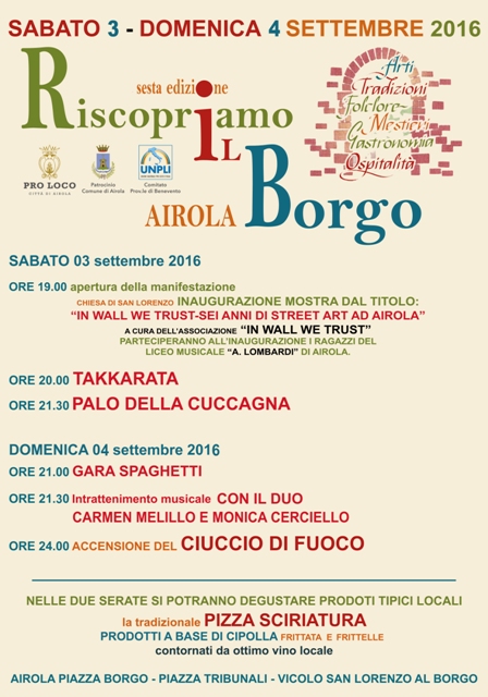 L’appuntamento è per sabato alle 19.00, nel piazzale antistante la Chiesa di San Lorenzo al Borgo, monumento chiuso per 60 anni circa e riaperto al pubblico solo nel 2011 grazie agli sforzi dei promotori, proprio in occasione della prima edizione della kermesse. Quest’anno la chiesa ospiterà la mostra dal titolo “In wall we trust-sei anni di Street Art ad Airola”, a cura dell’associazione “In wall we trust”. Una panoramica sull’esperienze artistiche e sulle sensazioni dell’associazione in questi anni di attività nella città caudina. La manifestazione procederà con il concerto di musica popolare del Gruppo folk “La Takkarata” di Fragneto Monforte (BN), che si esibirà alle ore 20:00 in poi. Il gran finale di giornata è riservato alPalo della Cuccagna”, in programma alle ore 21:30, antico gioco popolare airolano: diverse squadre si contenderanno il premio, posto in cima ad un palo insaponato da scalare a mani nude.